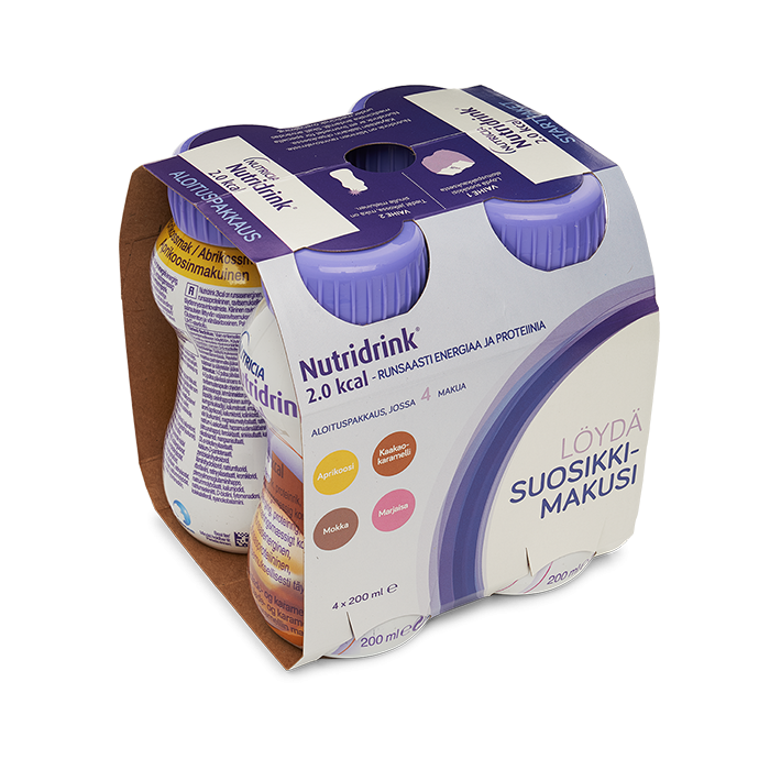 Nutridrink 2 kcal mixpack - kaikki neljä makua samassa pakkauksessa! Metsämarja, aprikoosi, kaakaokaramelli ja mokka.
