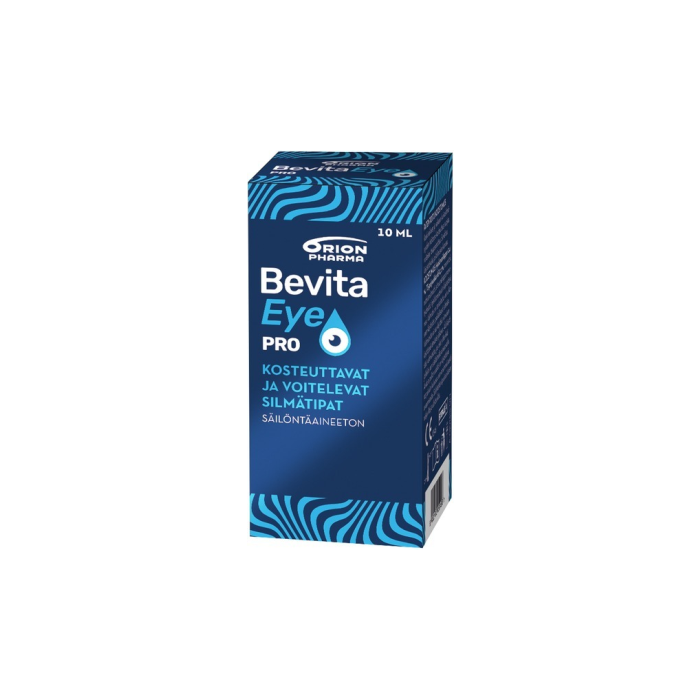 Bevita Eye Pro on säilöntäaineeton silmätippaliuos, joka soveltuu keskivaikean ja vaikean kuivasilmäisyyden hoitoon. Se kosteuttaa, suojaa, voitelee ja tasapainottaa. Valmiste soveltuu tutkitusti erityisen hyvin käytettäväksi piilolinssien kanssa. Oireita helpottava vaikutus on tutkitusti pitkäkestoinen. Patentoitu koostumus on myös säilöntäaineeton ja fosfaatiton.
