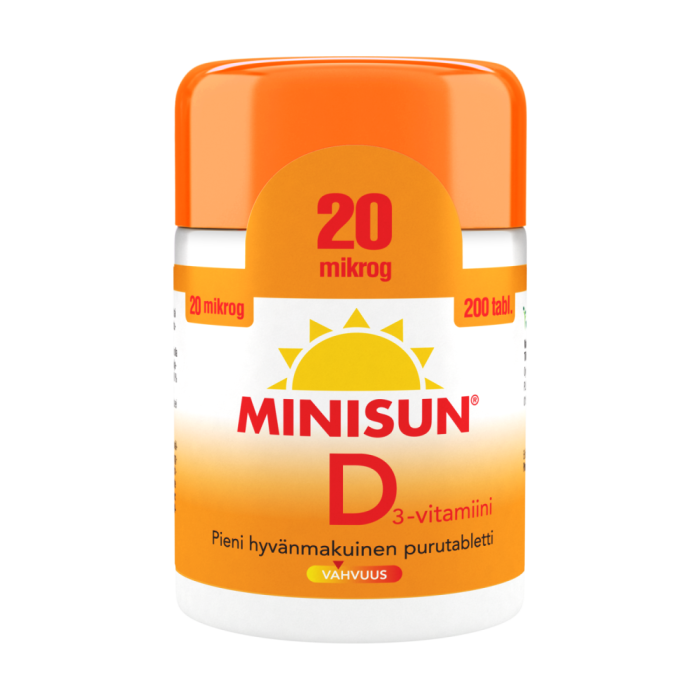 Minisun D-vitaminserien som utvecklats i Finland är ett enkelt sätt att trygga behovet av vitamin D året om. Minisun 20 mikrog innehåller vitamin D3 som effektivt tas upp i kroppen. Vitamin D förstärker motståndskraften och är ett viktigt vitamin för välmående benstomme, muskler och tänder. Doseringen är enkel - en liten tuggtablett per dag räcker till. Minisun 20 mikrogram lämpar sig för unga och vuxna för ett effektiverat dagligt intag året om. Tabletterna är sötade med xylitol, och de kan tas både som sug- och tuggtabletter, sväljas hela eller krossas. Produkten innehåller varken laktos, gluten, jäst, soja eller gelatin.